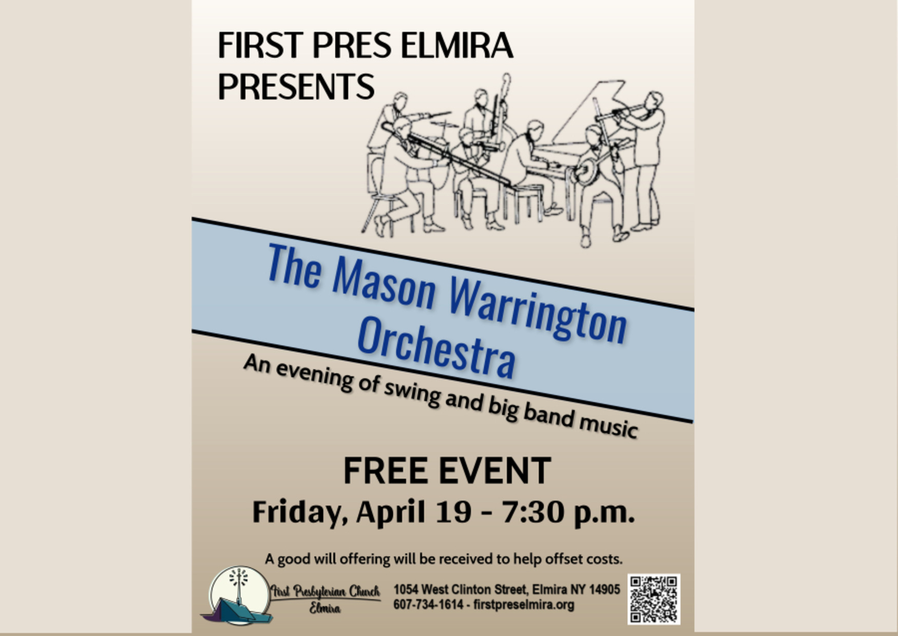 Join us for an evening of swing and big band music with the area's premier big band. The bang features top Southern Tier musicians. The Mason Warrington Orchestra's repertoire pulls from the authentic arrangements from the books of Count Basie, Les Brown, Benny Goodman, Glenn Miller, Tommy Dorsey, and other bands. This is a concert you don’t want to miss.